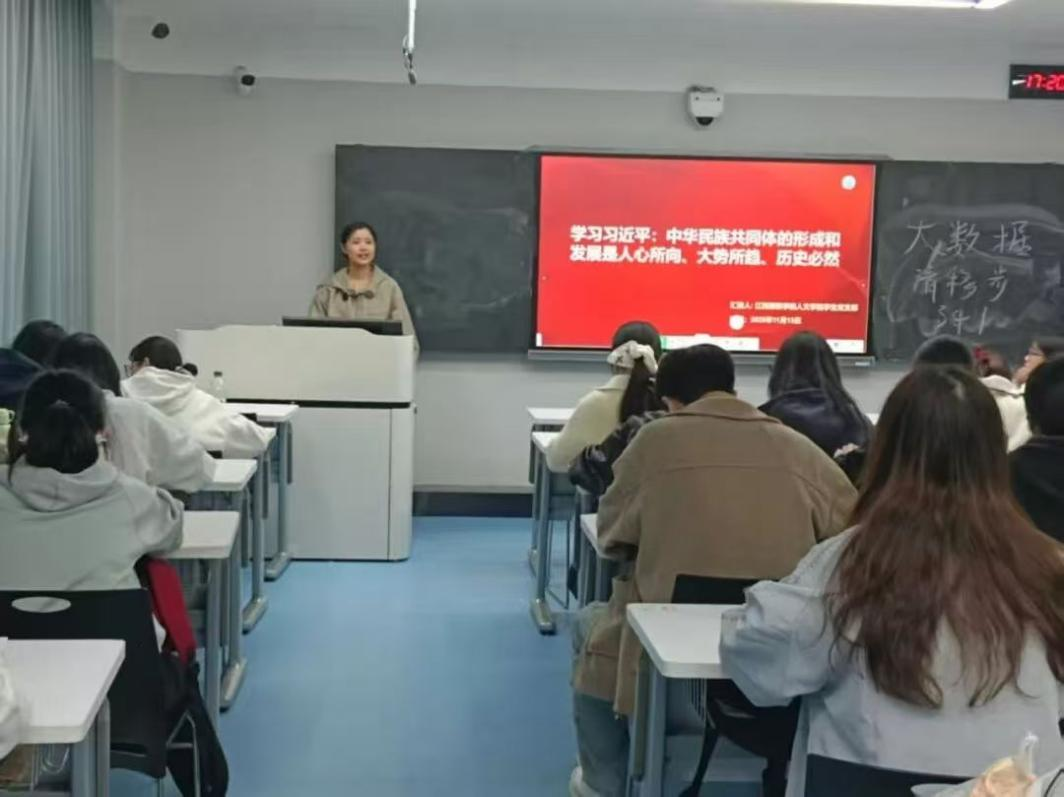 【人文学院讯 王 琪撰稿】为深刻领悟新时代民族工作的核心要义,夯实入党积极分子的思想根基,2025年11月13日17:20,江西服装学院人文学院学生党支部于主教楼342教室,组织第39、40期全体入党积极分子开展了以“深入学习习近平总书记关于中华民族共同体的重要论述——中华民族共同体的形成和发展是人心所向、大势所趋、历史必然”为主题的集中学习,由贺琦珂同学主持。
