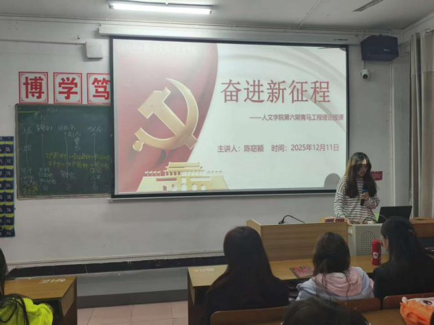 【人文学院 邓佳谊撰稿】为深入学习贯彻党的二十大及党的二十届四中全会精神,进一步落实共青团中央“学习二十大、永远跟党走、奋进新征程”主题教育要求,2025年12月11日晚6:00,我院团委于主教楼603室举行第六期青马工程理论授课,主讲人为我院团委学生副书记陈窈颖,主要围绕理论武装、团队活动、实践建功、服务引领这四大核心板块,为青年学子带来了一场深刻的思想洗礼与行动指引。