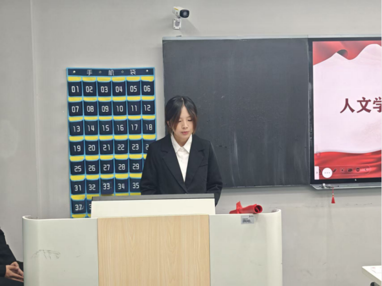 活动在庄重而热烈的氛围中拉开帷幕。开场启幕环节,全体团员起立,齐唱《义勇军进行曲》,激昂的歌声瞬间点燃现场气氛。人文学院团委学生副书记陈窈颖结合人文专业特色,阐述活动主题“赓续人文精神,勇担青春使命”的深刻意义,介绍活动核心环节与流程,引出人文精神传承与青春使命的核心议题,为后续活动奠定基调。