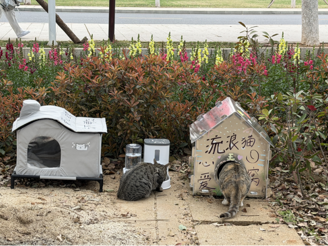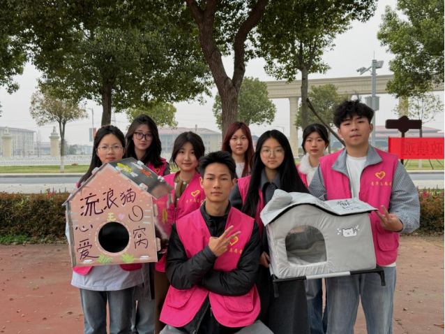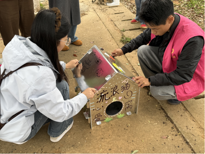 随后,大家将装饰好的猫窝,连同备好的猫粮、饮用水及清洁工具带到指定点位,把猫窝安置在猫咪常出现的角落,为四处漂泊的流浪小猫搭建起安稳的休憩之所。志愿者们还在猫窝周边摆放好干净的粮碗与水盆,细心清理周边的垃圾杂物,保持校园卫生的干净整洁。