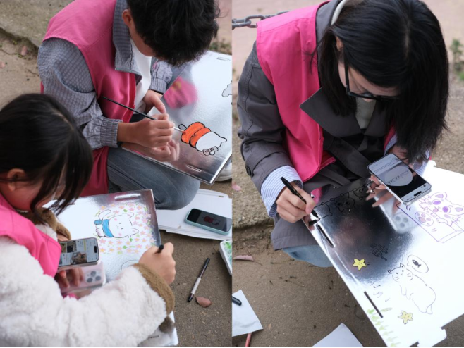 活动现场,志愿者们满怀爱心投入到猫窝的筹备与搭建工作中。大家先将提前准备的猫窝平铺展开,细心进行组装固定,确保猫窝稳固结实,能为流浪猫咪抵御风雨。组装完成后,核心的装饰环节充满温情——志愿者们围坐在一起,拿出调色盘、马克笔与画笔,结合手机里的可爱图案参考,在爱心猫窝上创作。大家一笔一画勾勒出憨态可掬的猫咪简笔画,还搭配了星星、爱心等童趣元素;左侧猫窝上“爱心猫窝”的字样,经大家精心设计和书写,既醒目又充满暖意。细腻的笔触、鲜活的色彩,让原本简约的猫窝蜕变成充满童趣与温度的“猫咪小城堡”,每一处涂鸦都承载着志愿者们对小生命的温柔期许。