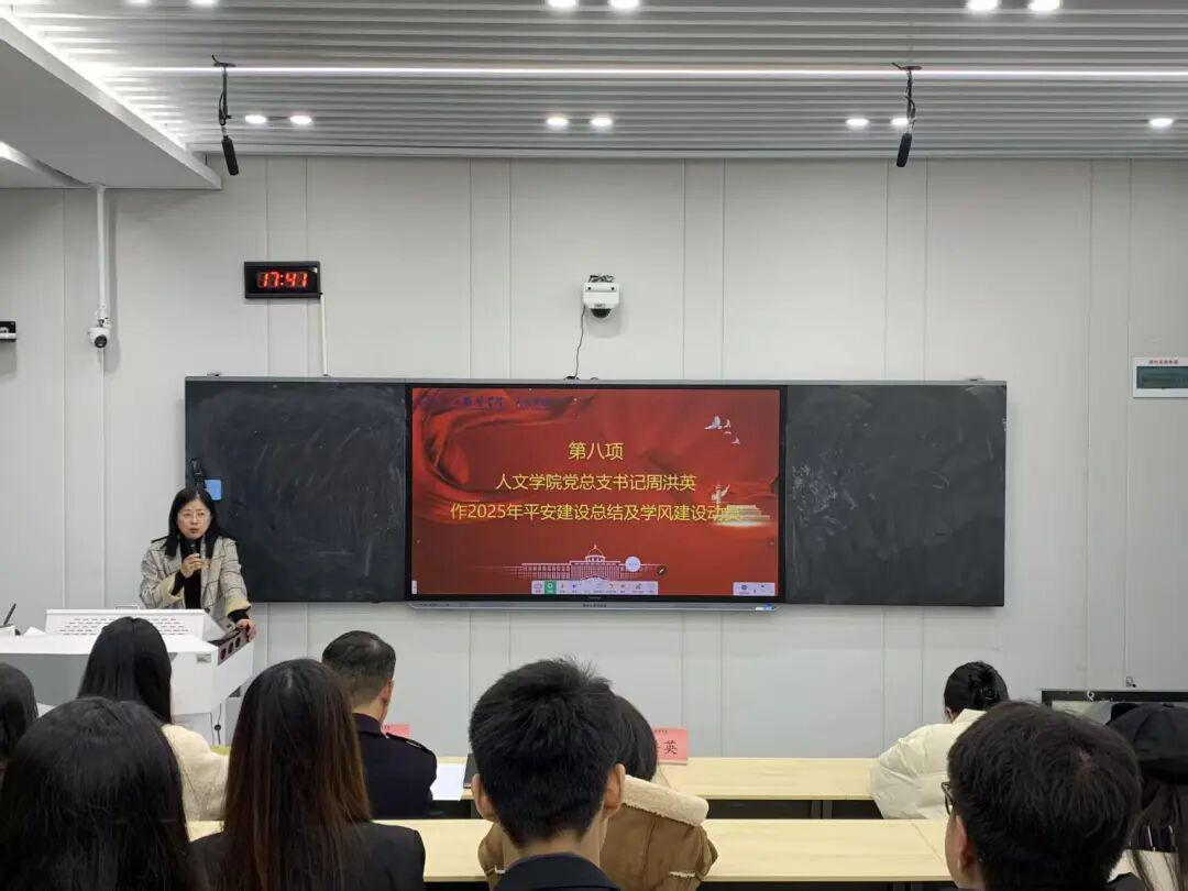人文学院党总支书记周洪英最后作2025年平安建设总结报告,并就学风建设作动员讲话。她全面回顾了过去一年学院在平安校园创建、安全隐患排查、学生安全教育等方面的工作成效,深刻剖析了当前学风建设中存在的问题与不足,强调要以此次会议为契机,将平安建设与学风建设深度融合,引导全体师生强化安全意识、端正学习态度,共同打造安全有序、勤学善思的校园环境。