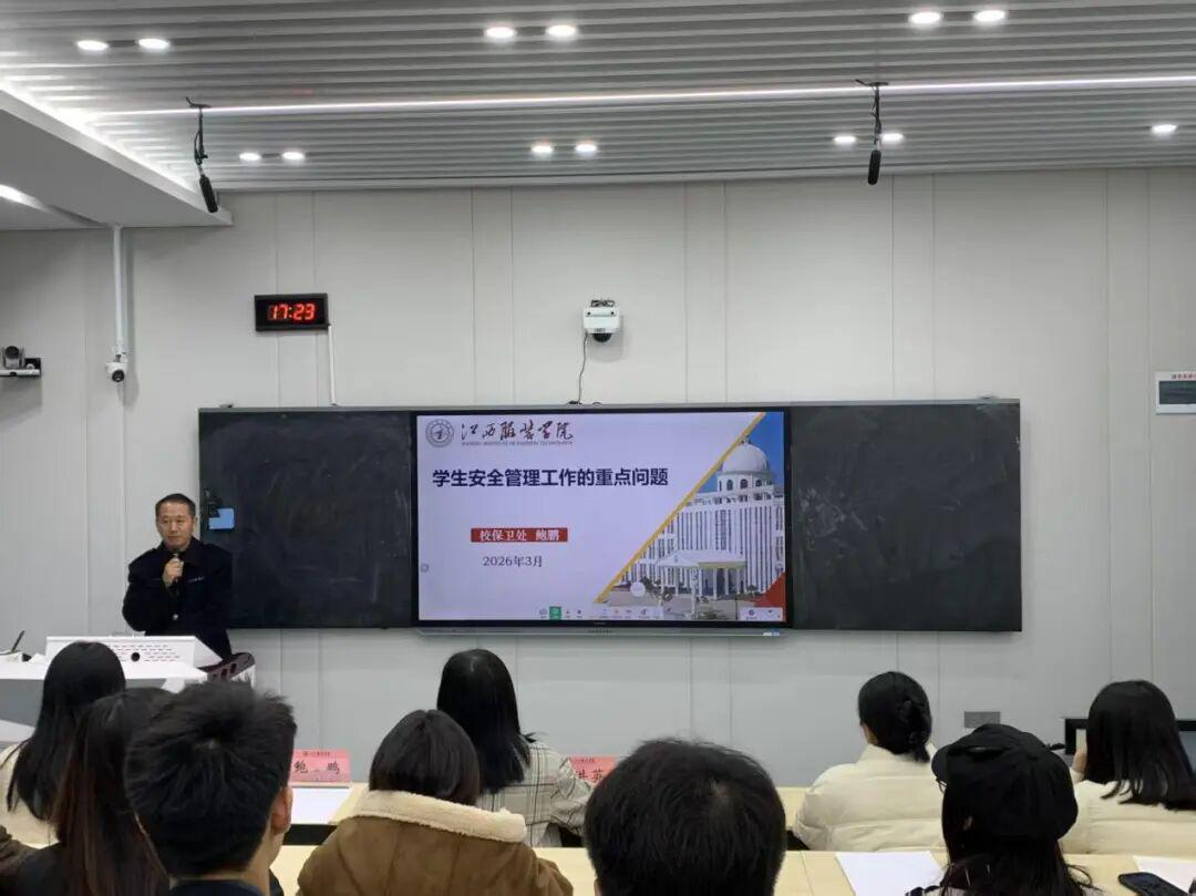 【人文学院讯 邓佳谊撰稿】为进一步筑牢校园安全防线,涵养优良学风,营造和谐育人氛围,3月19日17点,江西服装学院人文学院在主教学楼128教室召开2026年平安建设宣传月动员大会暨学风建设推进会。校保卫处处长鲍鹏,人文学院党总支书记周洪英、学工办副主任王艳艳,全体辅导员及全院班干代表、学生代表齐聚一堂,共话平安建设与学风发展。