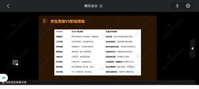 在“培养职场思维”模块中,易老师首先带领同学们开展思维自查,剖析了“爱当‘伸手党’”“被动接受安排”“万事准备完美才行动”等典型学生思维误区,并通过多维度对比,清晰呈现了学生思维与职场思维在问题解决、工作态度、沟通方式、目标导向等方面的差异,强调职场思维并非与学生思维对立,而是在其基础上增强责任意识、协作能力和价值创造能力。