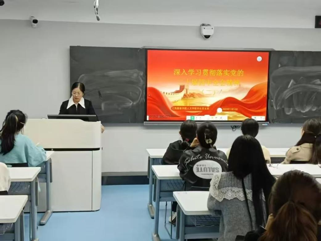 【人文学院讯翟雨晴撰稿】为引导入党积极分子深入学习党的二十届四中全会精神,将个人理想融入国家发展伟业,2025年11月12日17:20,江西服装学院人文学院学生党支部于主教楼342教室组织第39、40期积极分子开展集中学习。本次学习由人文学院党总支副书记周洪英主讲。
