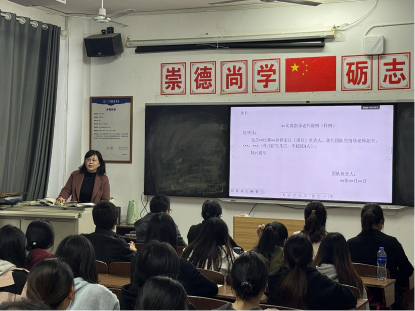 邹院长阐述了“双创”赛事对于学院专业发展及学生个人成长的重要意义,她强调,“双创”赛事是推动学院教育教学改革、提升人才培养质量的重要抓手,通过赛事可以检验学生的学习成果,促进专业知识的转化与应用。同时,邹院长也对双创委员的工作提出了具体要求和殷切期盼,希望他们能够充分发挥桥梁纽带作用,积极组织动员同学参与赛事,为学院的“双创”工作贡献力量。她鼓励双创委员们要勇于担当、主动作为,在赛事筹备过程中锻炼自己的组织协调能力和领导力,为未来的职业发展打下坚实的基础。