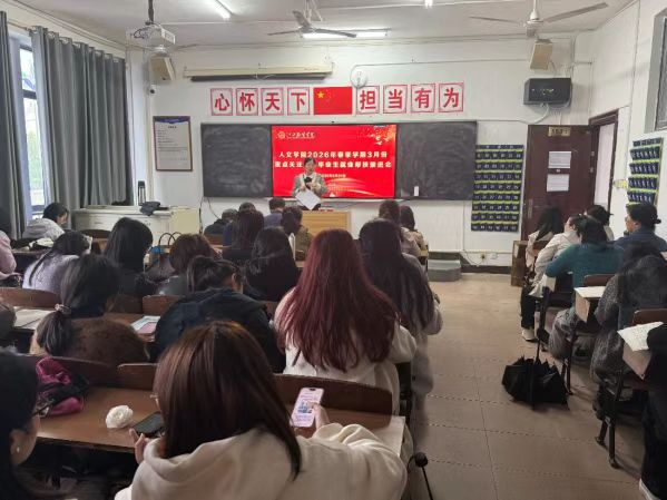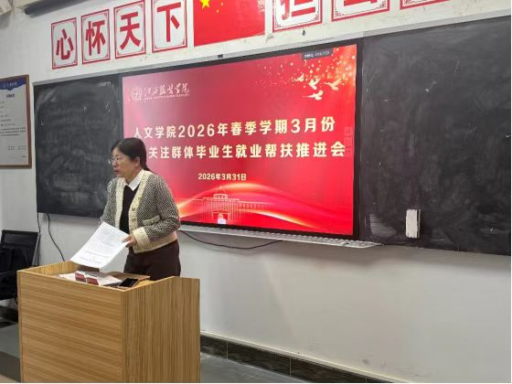 【人文学院讯 邓子欣撰稿】为深入贯彻落实学校就业工作部署,扎实推进2026届毕业生就业工作,3月31日下午1:30,人文学院在主教楼131教室召开2026年春季学期3月份重点关注群体毕业生就业帮扶推进会。会议由人文学院党总支书记周洪英主持,院长邹晓春、副书记陈家华、副院长付凌云及全体帮扶老师共同参与,会议全面分析了当前就业形势,部署了下一阶段重点工作,吹响了全员促就业的冲锋号。